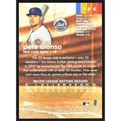 This is a 2020 Stadium Club Pete Alonso baseball card. The card is #164 and pictures show condition.