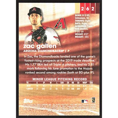 This is a 2020 Stadium Club Zac Gallen baseball card. The card is #262 and pictures show condition.