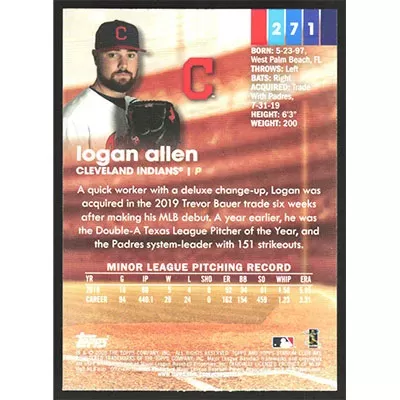 This is a 2020 Stadium Club Logan Allen baseball card. The card is #271 and pictures show condition.