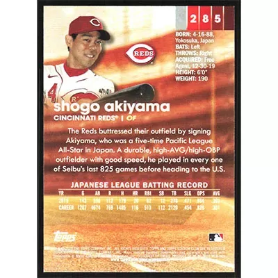 This is a 2020 Stadium Club Shogo Akiyama baseball card. The card is #285 and pictures show condition.