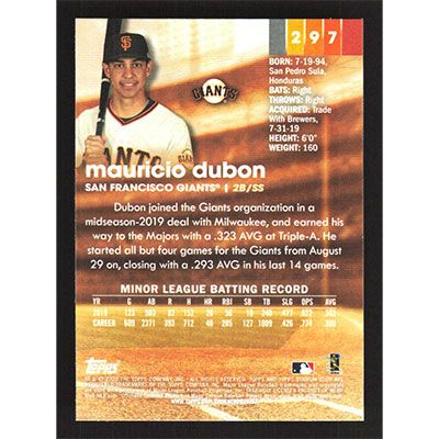 This is a 2020 Stadium Club Mauricio Dubon baseball card. The card is #297 and pictures show condition. Team(s): San Francisco Giants Rookie Card (RC)
