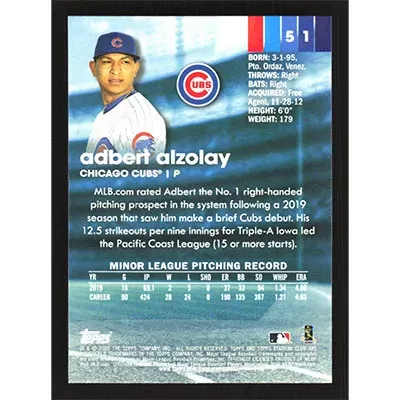 This is a 2020 Stadium Club Adbert Alzolay baseball card. The card is #51 and pictures show condition.
