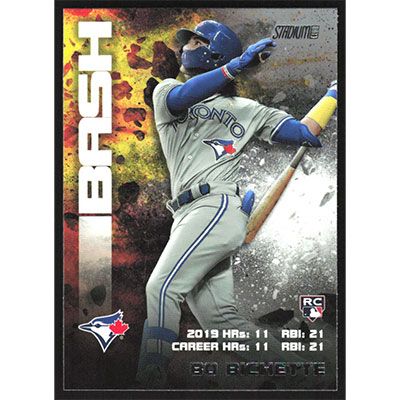 This is a 2020 Stadium Club Bash & Burn Bo Bichette baseball card. The card is #BAB-14 and pictures show condition. Team(s): Toronto Blue Jays Rookie Card (RC)