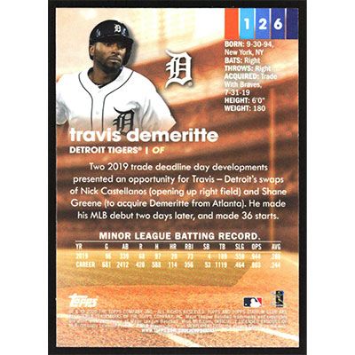 This is a 2020 Stadium Club Chrome Travis Demeritte baseball card. The card is #126 and pictures show condition. Team(s): Detroit Tigers Rookie Card (RC)