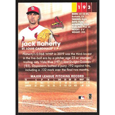 This is a 2020 Stadium Club Chrome Jack Flaherty baseball card. The card is #193 and pictures show condition.