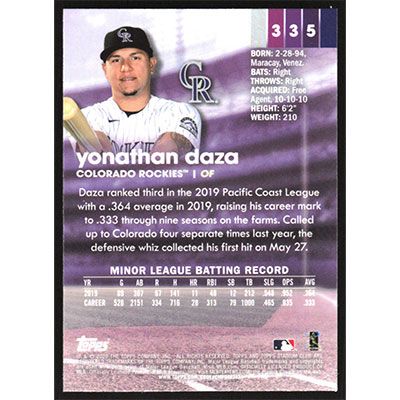 This is a 2020 Stadium Club Chrome Yonathan Daza baseball card. The card is #335 and pictures show condition. Team(s): Colorado Rockies Rookie Card (RC)