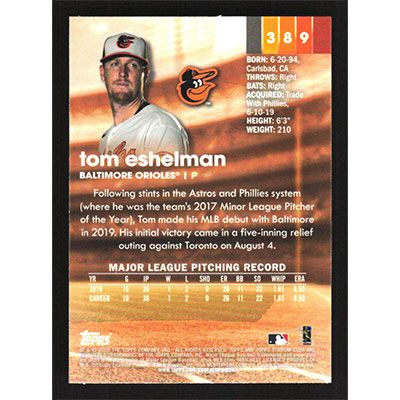 This is a 2020 Stadium Club Chrome Tom Eshelman baseball card. The card is #389 and pictures show condition. Team(s): Baltimore Orioles Rookie Card (RC)