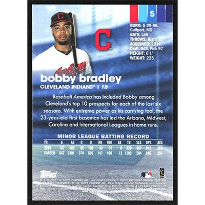 This is a 2020 Stadium Club Chrome Bobby Bradley baseball card. The card is #5 and pictures show condition. Team(s): Cleveland Indians Rookie Card (RC)