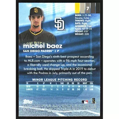 This is a 2020 Stadium Club Chrome Michel Baez baseball card. The card is #7 and pictures show condition.