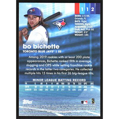This is a 2020 Stadium Club Chrome Insert Bo Bichette baseball card. The card is #112 and pictures show condition. Team(s): Toronto Blue Jays Rookie Card (RC)