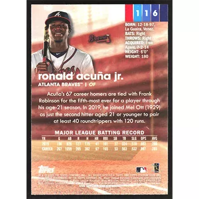 This is a 2020 Stadium Club Chrome Insert Ronald Acuña Jr. baseball card. The card is #116 and pictures show condition.