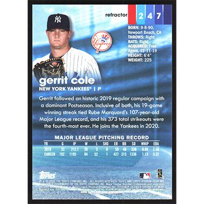 This is a 2020 Stadium Club Chrome Insert Refractors Gerrit Cole baseball card. The card is #247 and pictures show condition.