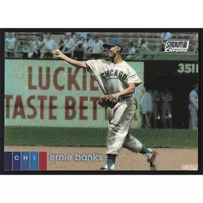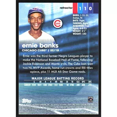 This is a 2020 Stadium Club Chrome Refractors Ernie Banks baseball card. The card is #110 and pictures show condition.