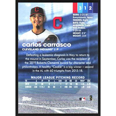 This is a 2020 Stadium Club Chrome X-Fractors Carlos Carrasco baseball card. The card is #312 and pictures show condition.