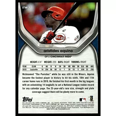 This is a 2020 Stadium Club In the Wings Aristides Aquino baseball card. The card is #ITW-7 and pictures show condition. Team(s): Cincinnati Reds Rookie Card (RC)