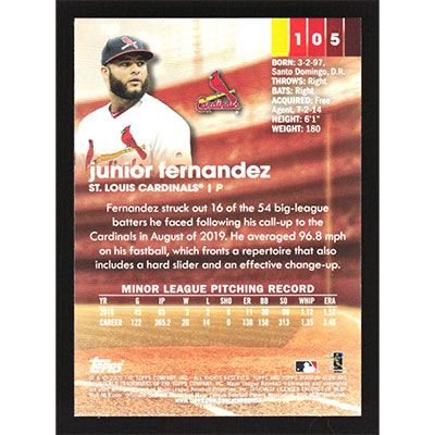 This is a 2020 Stadium Club Red Foil Junior Fernandez baseball card. The card is #105 and pictures show condition. Team(s): St. Louis Cardinals Rookie Card (RC)