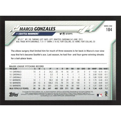 This is a 2020 Topps Marco Gonzales baseball card. The card is #104 and pictures show condition.