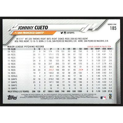 This is a 2020 Topps Johnny Cueto baseball card. The card is #185 and pictures show condition.