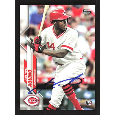 This is a 2020 Topps Aristides Aquino autographed baseball card. This card has been signed, in blue, by Aristides Aquino, and is guaranteed authentic by Ballcardz.com. The card is #20 and pictures show condition.