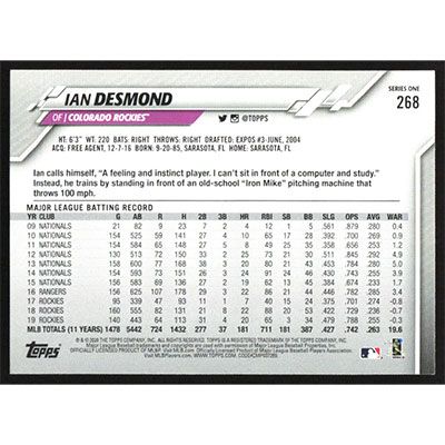 This is a 2020 Topps Ian Desmond baseball card. The card is #268 and pictures show condition.
