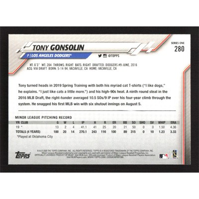 This is a 2020 Topps Tony Gonsolin baseball card. The card is #280 and pictures show condition.