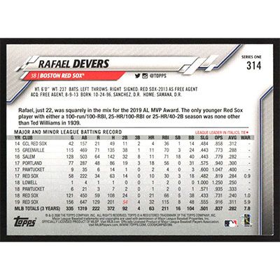 This is a 2020 Topps Rafael Devers baseball card. The card is #314 and pictures show condition.