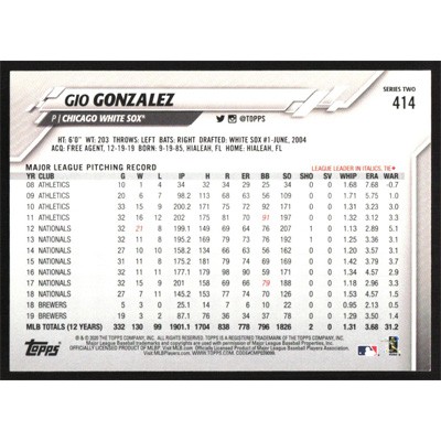 This is a 2020 Topps Gio Gonzalez baseball card. The card is #414 and pictures show condition.