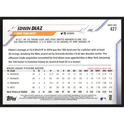 This is a 2020 Topps Edwin Diaz baseball card. The card is #427 and pictures show condition.