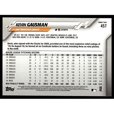 This is a 2020 Topps Kevin Gausman baseball card. The card is #457 and pictures show condition.