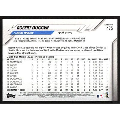This is a 2020 Topps Robert Dugger baseball card. The card is #475 and pictures show condition.