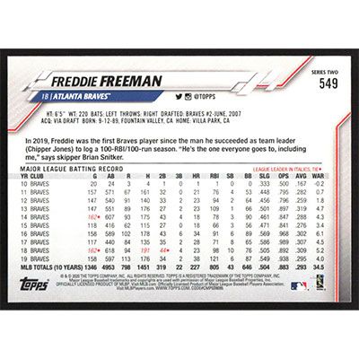 This is a 2020 Topps Freddie Freeman baseball card. The card is #549 and pictures show condition.