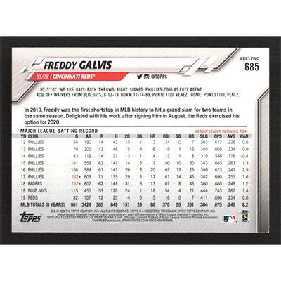 This is a 2020 Topps Freddy Galvis baseball card. The card is #685 and pictures show condition.