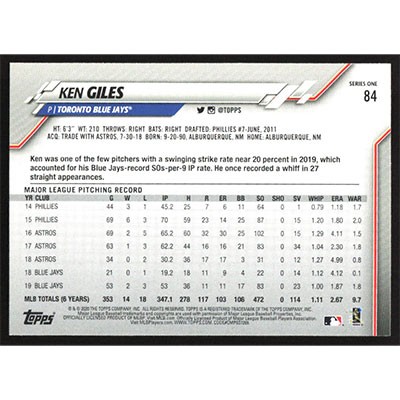 This is a 2020 Topps Ken Giles baseball card. The card is #84 and pictures show condition.