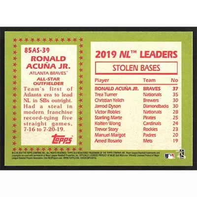 This is a 2020 Topps '85 All-Stars Blue Ronald Acuña Jr. baseball card. The card is #85AS-39 and pictures show condition.