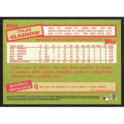 This is a 2020 Topps '85 Series 2 Tyler Glasnow baseball card. The card is #85TB-45 and pictures show condition.