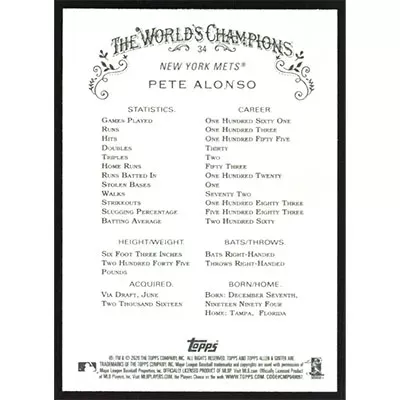 This is a 2020 Topps Allen & Ginter Pete Alonso baseball card. The card is #34 and pictures show condition.