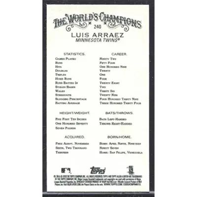 This is a 2020 Topps Allen & Ginter Mini Luis Arraez baseball card. The card is #240 and pictures show condition.