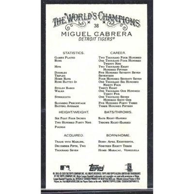 This is a 2020 Topps Allen & Ginter Mini Miguel Cabrera baseball card. The card is #38 and pictures show condition.