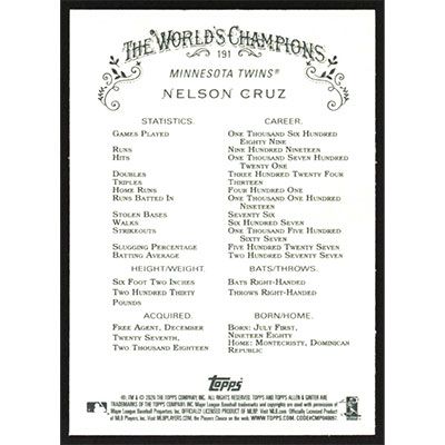 This is a 2020 Topps Allen & Ginter X Nelson Cruz baseball card. The card is #191 and pictures show condition.