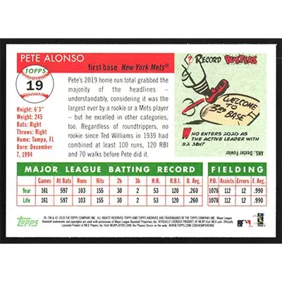 This is a 2020 Topps Archives Pete Alonso baseball card. The card is #19 and pictures show condition.