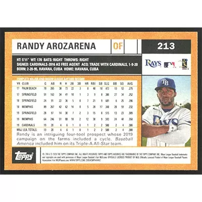 This is a 2020 Topps Archives Randy Arozarena baseball card. The card is #213 and pictures show condition.
