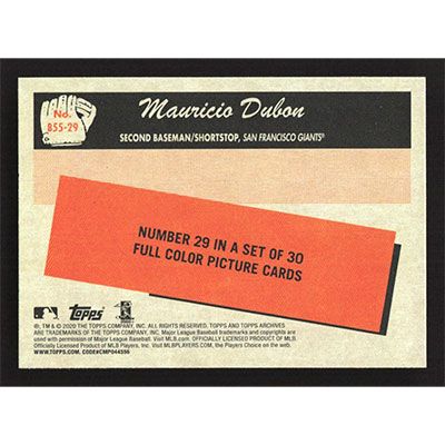 This is a 2020 Topps Archives '55 Bowman Mauricio Dubon baseball card. The card is #B55-29 and pictures show condition. Team(s): San Francisco Giants Rookie Card (RC)
