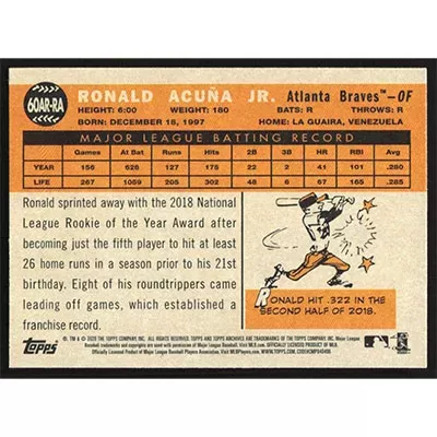 This is a 2020 Topps Archives '60 All-Star Rookies Ronald Acuña Jr. baseball card. The card is #60AR-RA and pictures show condition. Team(s): Atlanta Braves