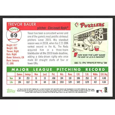 This is a 2020 Topps Archives Purple Trevor Bauer baseball card. The card is #69 and pictures show condition. This card is limited; #'d 169/175. Team(s): Cincinnati Reds