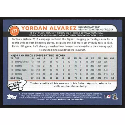 This is a 2020 Topps Big League Yordan Alvarez baseball card. The card is #123 and pictures show condition.