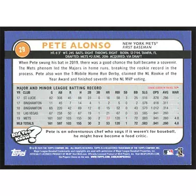 This is a 2020 Topps Big League Pete Alonso baseball card. The card is #29 and pictures show condition.