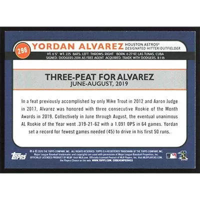 This is a 2020 Topps Big League Yordan Alvarez Highlights baseball card. The card is #296 and pictures show condition. Team(s): Houston Astros Rookie Card (RC)