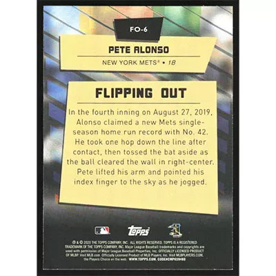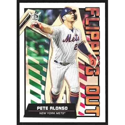 This is a 2020 Topps Big League Flipping Out Pete Alonso baseball card. The card is #FO-6 and pictures show condition.