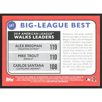 This is a 2020 Topps Big League Orange Alex Bregman, Mike Trout and Carlos Santana League Leaders baseball card. The card is #247 and pictures show condition.