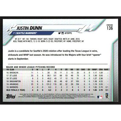 This is a 2020 Topps Chrome Justin Dunn baseball card. The card is #136 and pictures show condition.